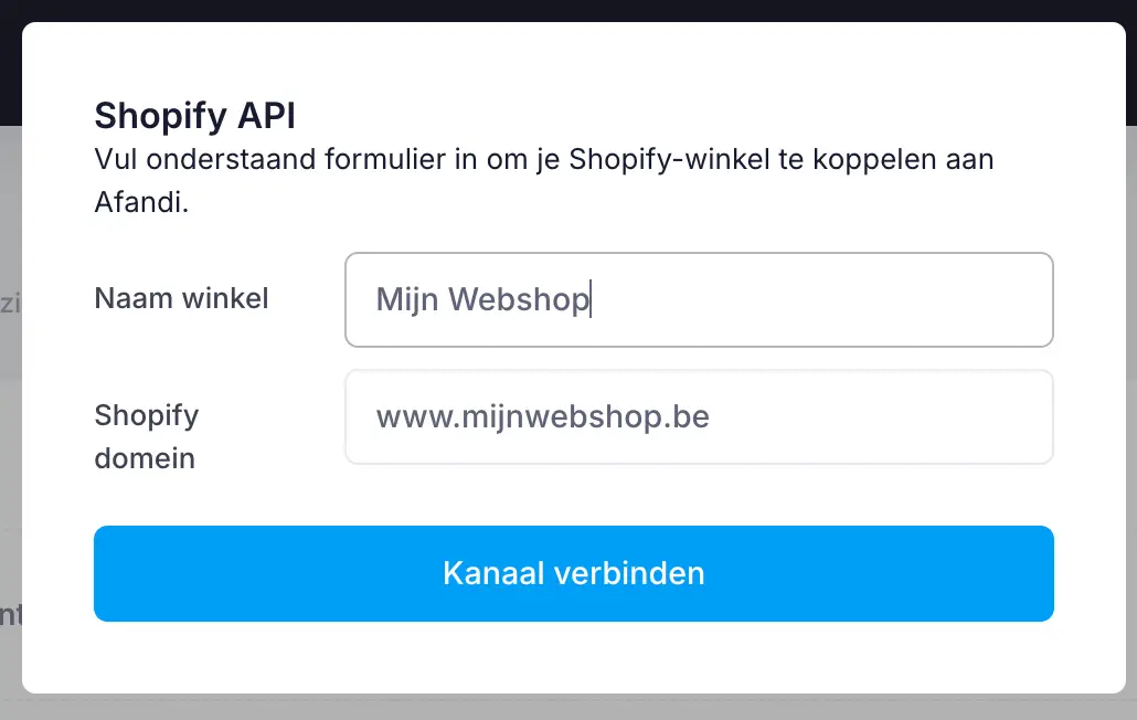 | Shopify Domein | mijnwinkel.myshopify.com | Zonder https:// of trailing slash |